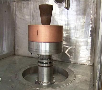 1307#產(chǎn)品ZGX-50B雙性能鑄造爐中的液壓隨動(dòng)傾轉(zhuǎn)澆注系統(tǒng)與離心轉(zhuǎn)動(dòng)機(jī)構(gòu)系統(tǒng)是整臺(tái)設(shè)備的核心部件,它可以將熔煉好的鋼液用模仿人的操控動(dòng)作快速準(zhǔn)確倒入模殼中,然后開動(dòng)轉(zhuǎn)動(dòng)機(jī)構(gòu),使水冷結(jié)晶器帶動(dòng)模殼按程序正反方向旋轉(zhuǎn),待高溫合金凝固后即得到細(xì)晶組織。這兩項(xiàng)動(dòng)作必須連貫無誤的操作執(zhí)行才能成功。